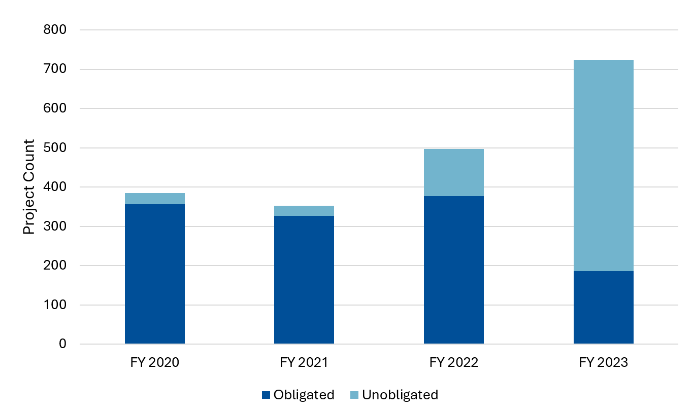 From fiscal years 2020-2023, 1,958 BRIC projects were awarded funding. Most of the grants awarded from BRIC in fiscal years 2020, 2021, and 2022 have been obligated. However, more than 500 fiscal year 2023 projects remain unobligated (Figure 1). In total, 1,246 projects have had their funding obligated, while 712 have not — 36 percent of projects awarded since 2020.