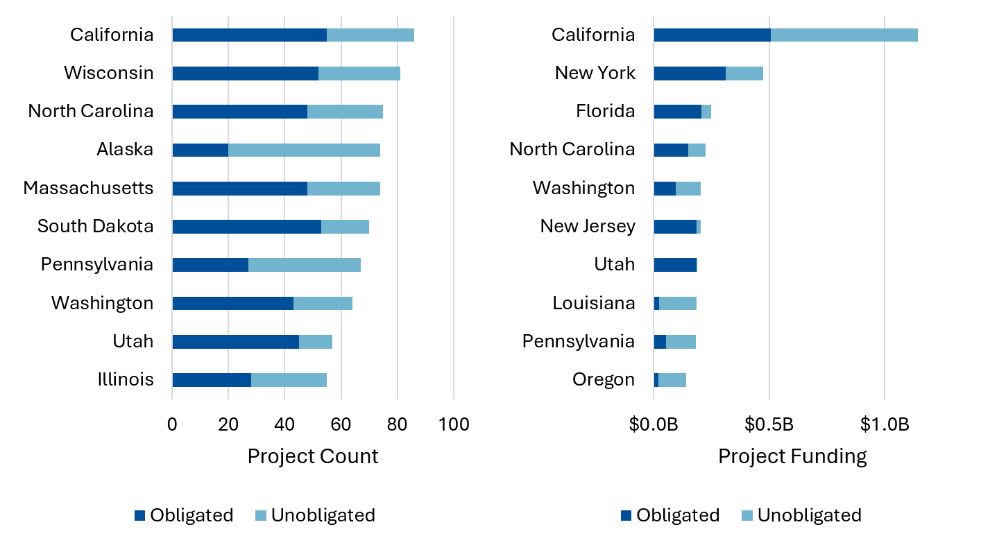 Figure 2: Top 10 States with Unobligated BRIC Projects, by Count and Funding Total