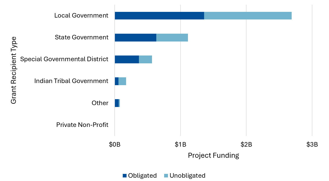 Finally, the overwhelming majority of BRIC funding is slated to support local governments and special districts, like water and wastewater, irrigation, and fire protection districts (Figure 4). Roughly half of these projects have yet to be obligated, totaling $1.5 billion in critical funding to help build resilience to natural disasters. Terminating these grants would be a blow to local communities, as the 85 to 90 percent federal match is often crucial to making mitigation and resilience projects fiscally feasible.