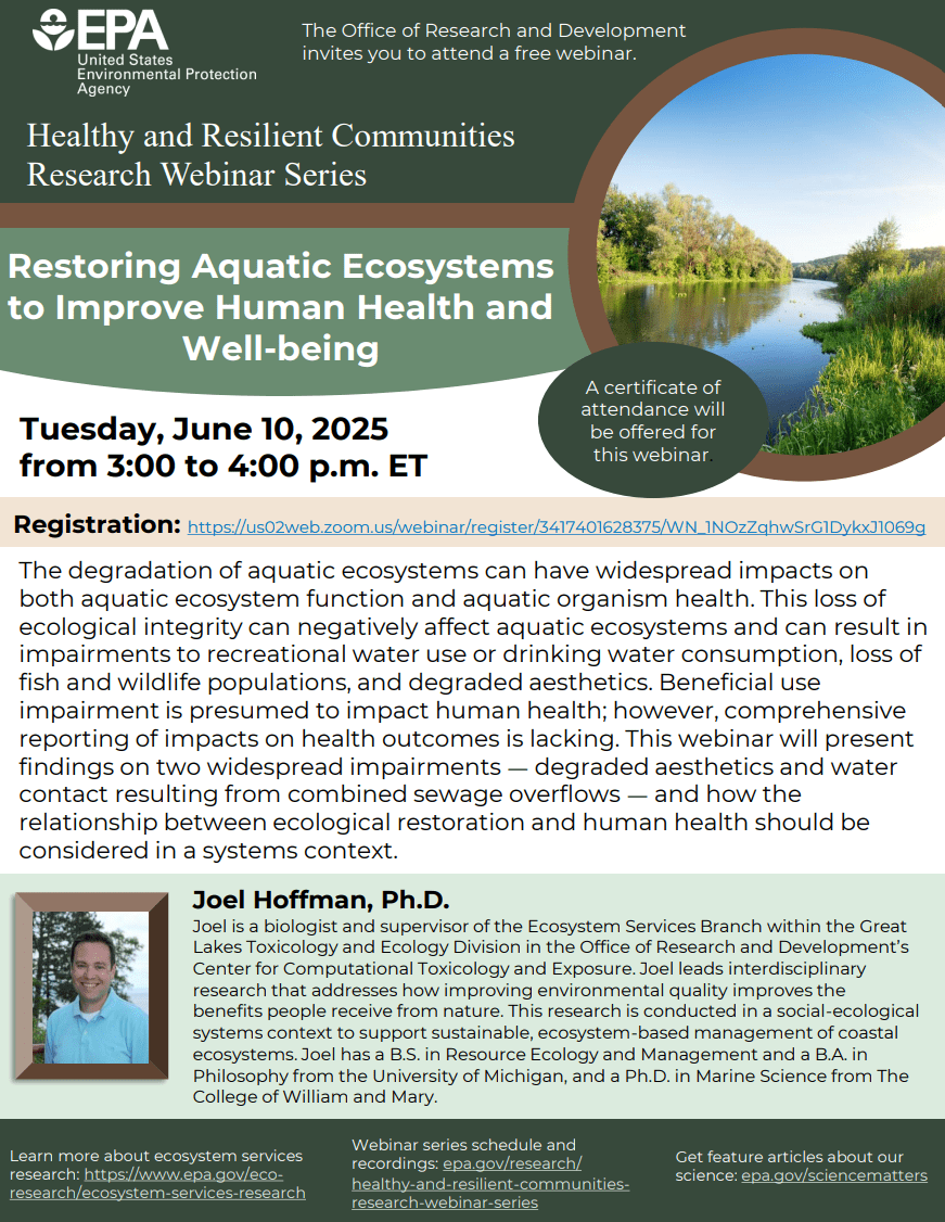 The degradation of aquatic ecosystems can have widespread impacts on both aquatic ecosystem function and aquatic organism health. This loss of ecological integrity can negatively affect aquatic ecosystems and can result in impairments to recreational water use or drinking water consumption, loss of fish and wildlife populations, and degraded aesthetics. Beneficial use impairment is presumed to impact human health; however, comprehensive reporting of impacts on health outcomes is lacking. This webinar will present findings on two widespread impairments — degraded aesthetics and water contact resulting from combined sewage overflows — and how the relationship between ecological restoration and human health should be considered in a systems context.