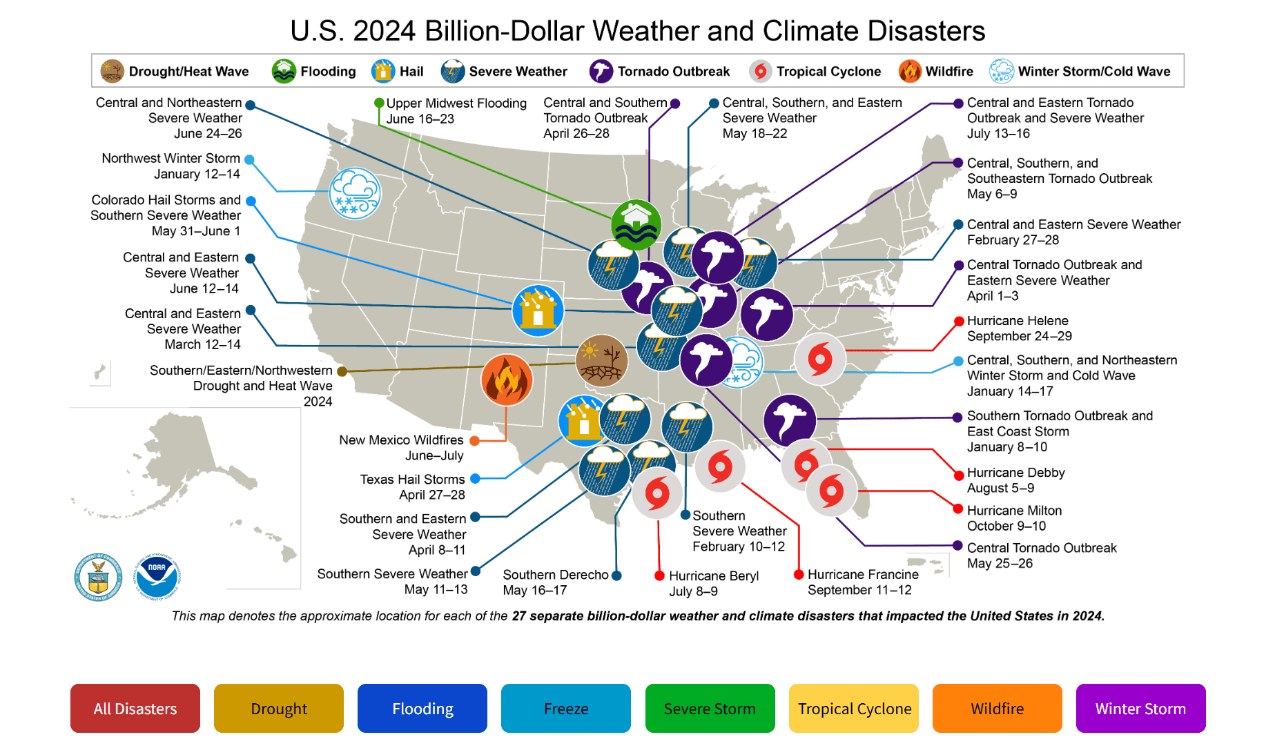 In 2024, there were 27 confirmed weather/climate disaster events with losses exceeding $1 billion each to affect United States. These events included 1 drought event, 1 flooding event, 17 severe storm events, 5 tropical cyclone events, 1 wildfire event, and 2 winter storm events. The 1980–2024 annual average is 9.0 events (CPI-adjusted); the annual average for the most recent 5 years (2020–2024) is 23.0 events (CPI-adjusted).